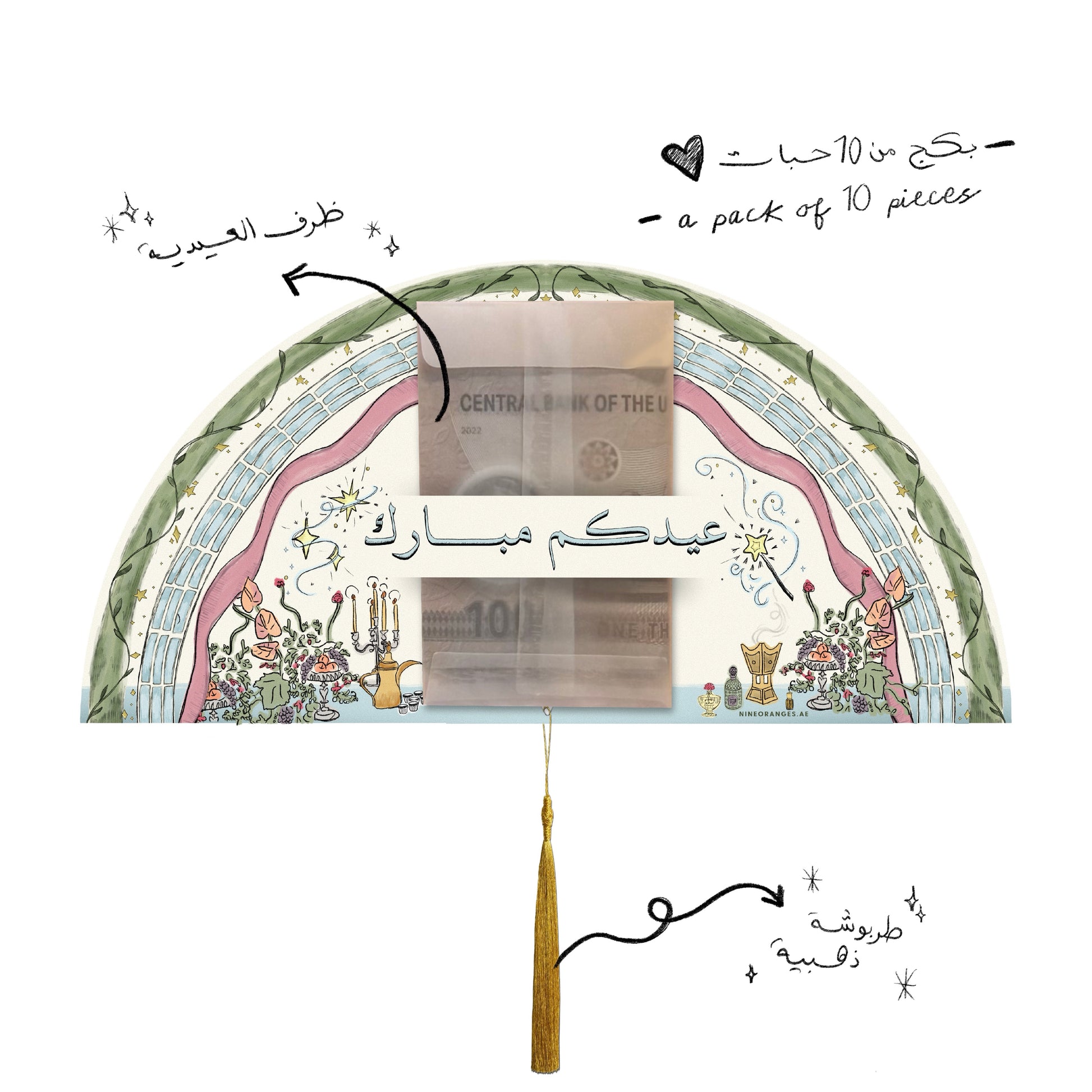 A set of 10 high-quality envelopes designed for Eidiya in an elegant way. Each envelope features a dedicated space for cash and a distinctive gold tassel.